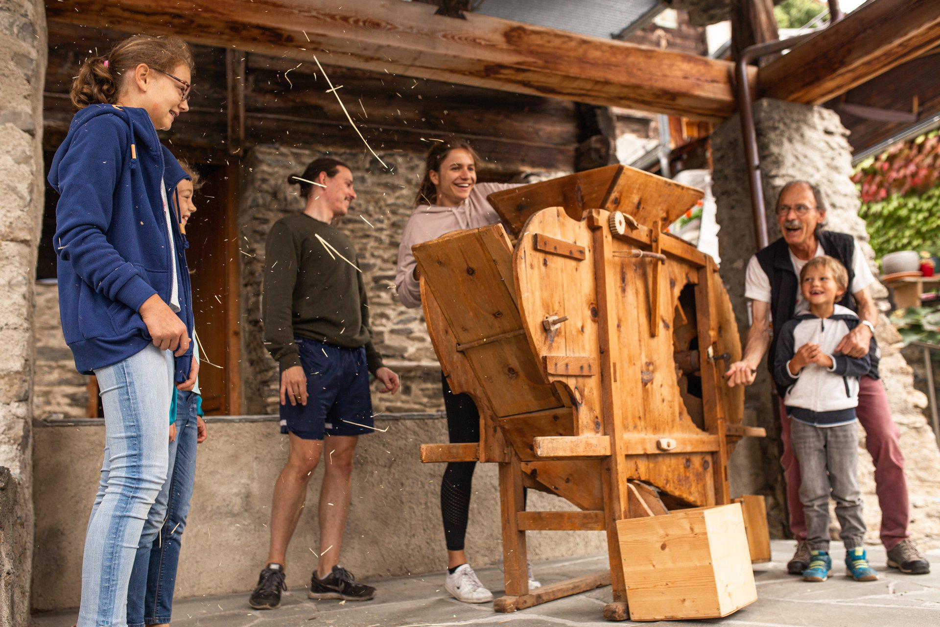 Besucher und Besucherinnen können selbst Hand anlegen. Sie bereiten den Teig vor, kneten ihn und formen ihr eigenes Brot. Anschließend wird es im Holzbackofen gebacken - und duftet herrlich. Zum Programm gehören auch ein Dorfrundgang, Dreschen in der historischen Scheune und Kurzfilme im Hohen Spycher. Ein volles Erlebnis für alle Sinne.