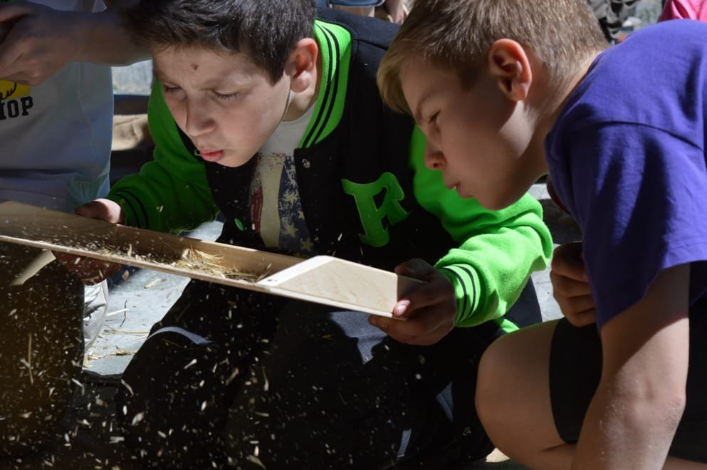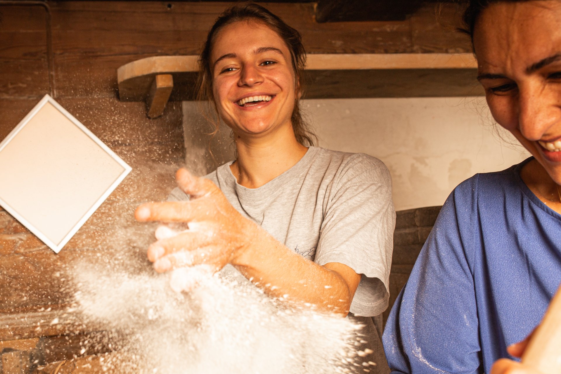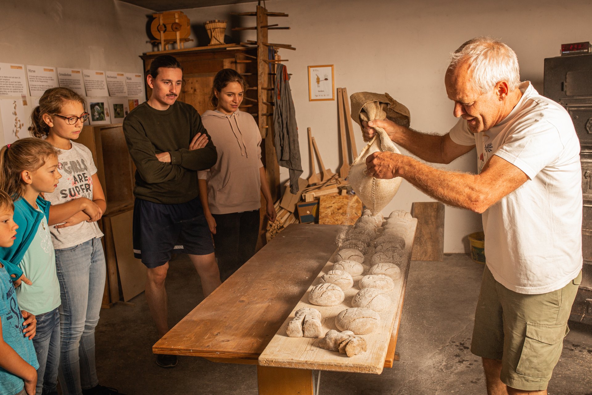 Dreschflegel, Korntuch, Goofe: Diese Instrumente lernen die SchülerInnen kennen, bis sie die Körner von der Spreu trennen. Im Mahlatelier finden sie heraus, welches Mahlsystem das beste Mehl herstellt. Dieses dürfen sie anschliessend mit nach Hause nehmen