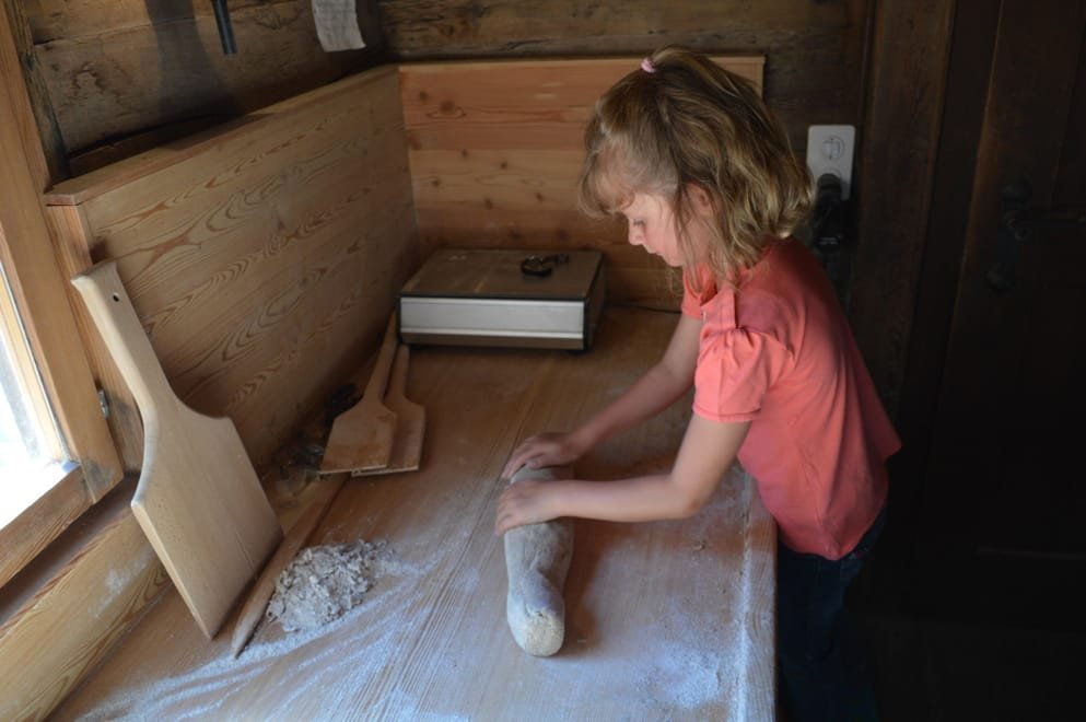 Wie viel Kraft das Teig kneten braucht, erfahren die JungbäckerInnen im Backhaus. Jeder Schüler formt sein eigenes Brot.