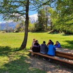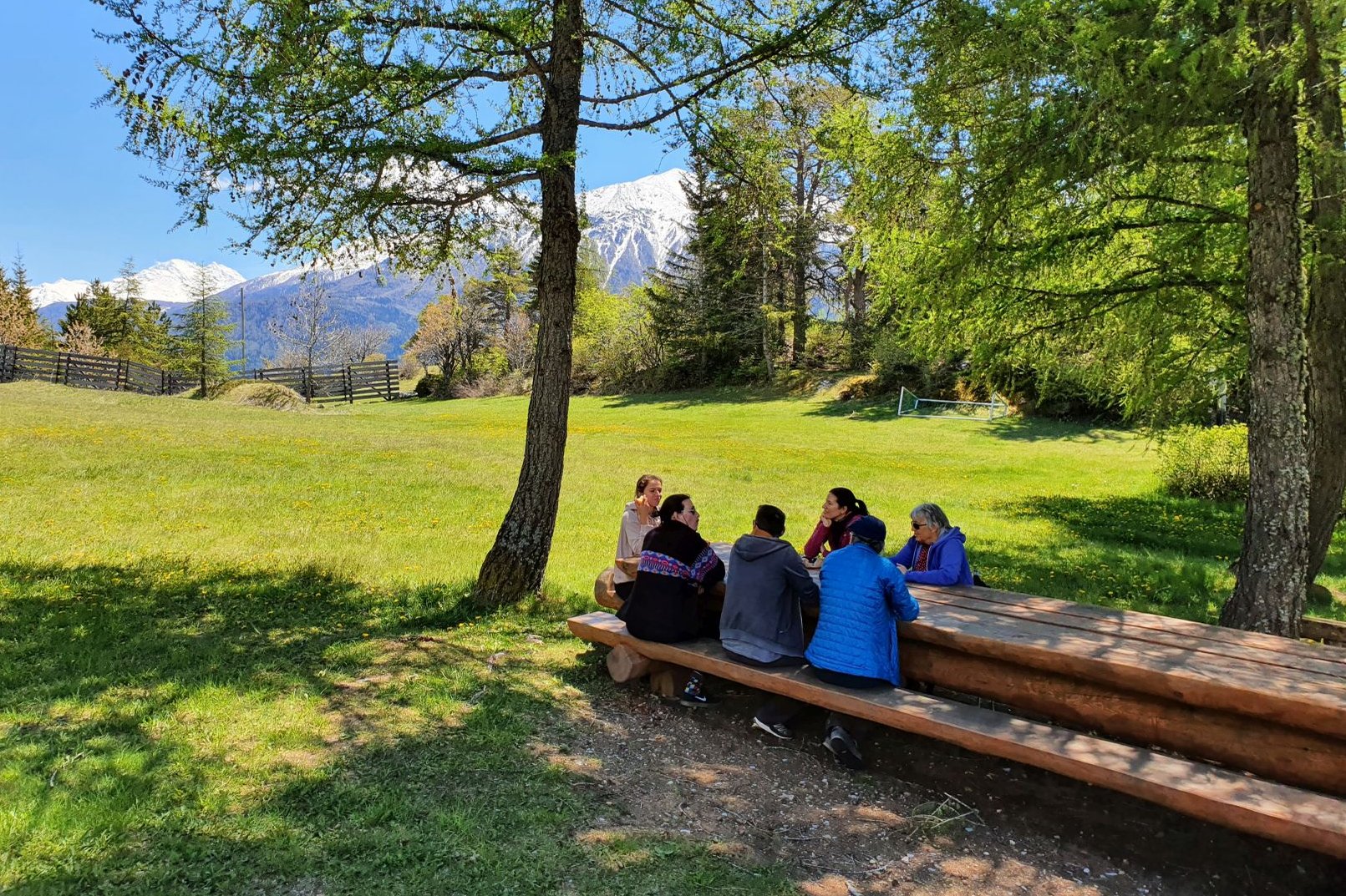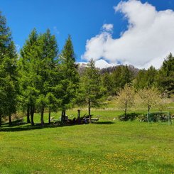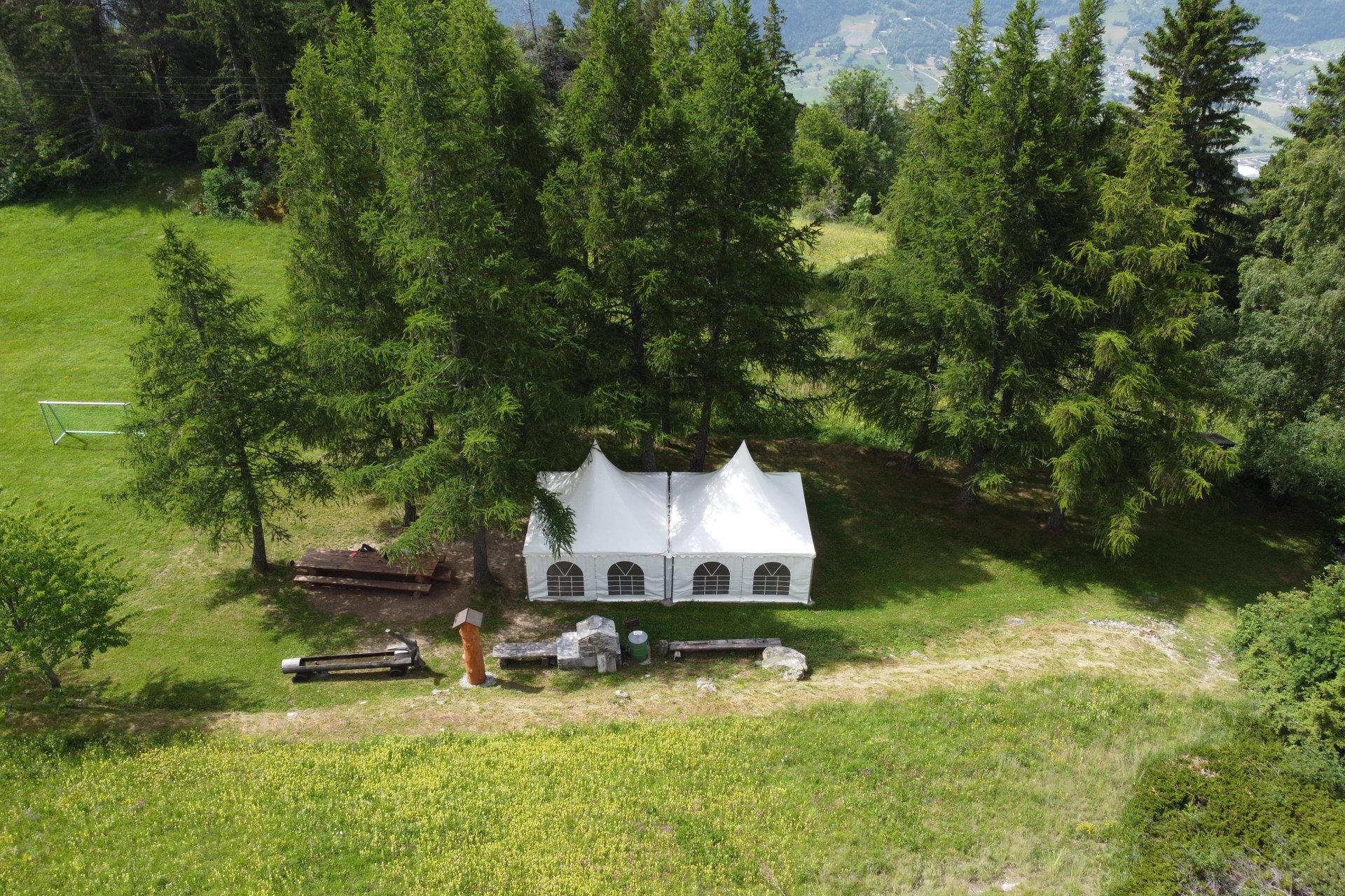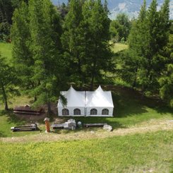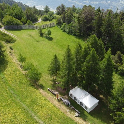 Im Grünen sein und zugleich alle Annehmlichkeiten für ein Fest, einen Ausflug, einen Spieltag zur Verfügung haben: grosses Partyzelt für alle Wetter, fliessend Wasser, Strom, Kühlschrank, WC - und natürlich viel Spielfläche für Jung und Alt.