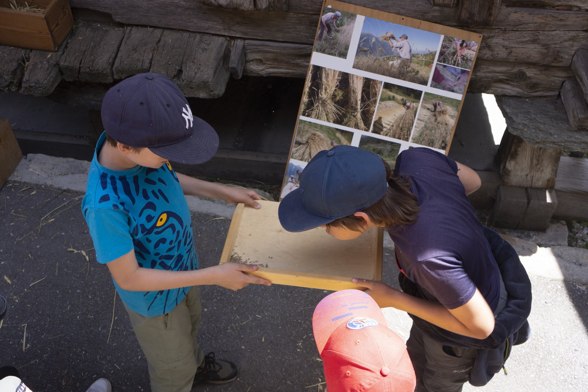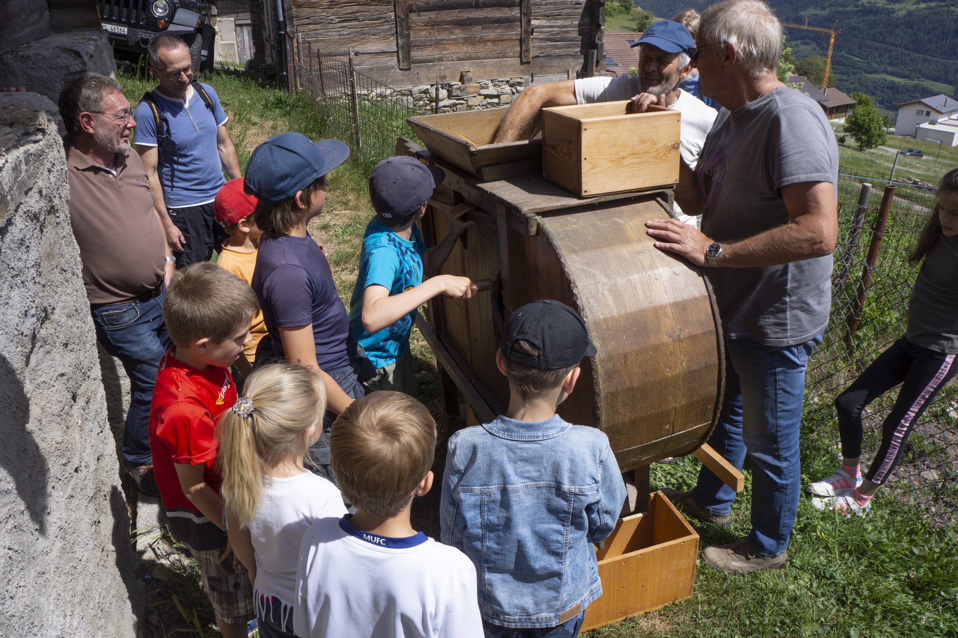 Das war eine kurzweilige, tolle Führung durch Erschmatt - von der Backstube, zum Hugostein und dann zum Stadel und zum Spycher, inkl. Quiz und vielerlei Aktivitäten. Den Kindern hat es besonders gut gefallen, als sie die Körner aus den Ähren herausgeschlagen haben, sie haben gedrescht. Dann haben wir mit einer Windmaschine die Spreu von den Roggenähren getrennt und danach die kleinen Körner zu Mehl gemahlen. Auch der Abschluss mit dem kurzen Film war toll.