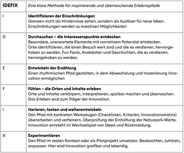 Die folgende Definition eines innovativen Lehrpfads in einem Naturpark wurden von den beteiligten Akteuren erarbeitet: ‘Ein Pfad, der überrascht, bildet und respektiert: Der innovative Naturparklehrpfad verbindet Eintauchen, Genuss und die Vermittlung der Werte des Parks und minimiert gleichzeitig von Anfang an seine Umweltwirkungen’. Im Verlauf der Literaturrecherche und der Erarbeitung der gemeinsamen Definition entstand eine neue Methode, die bei der Erarbeitung innovativer Lehrpfade hilfreich ist: IDEFIX – eine klare Struktur für inspirierende und überraschende Erlebnispfade.