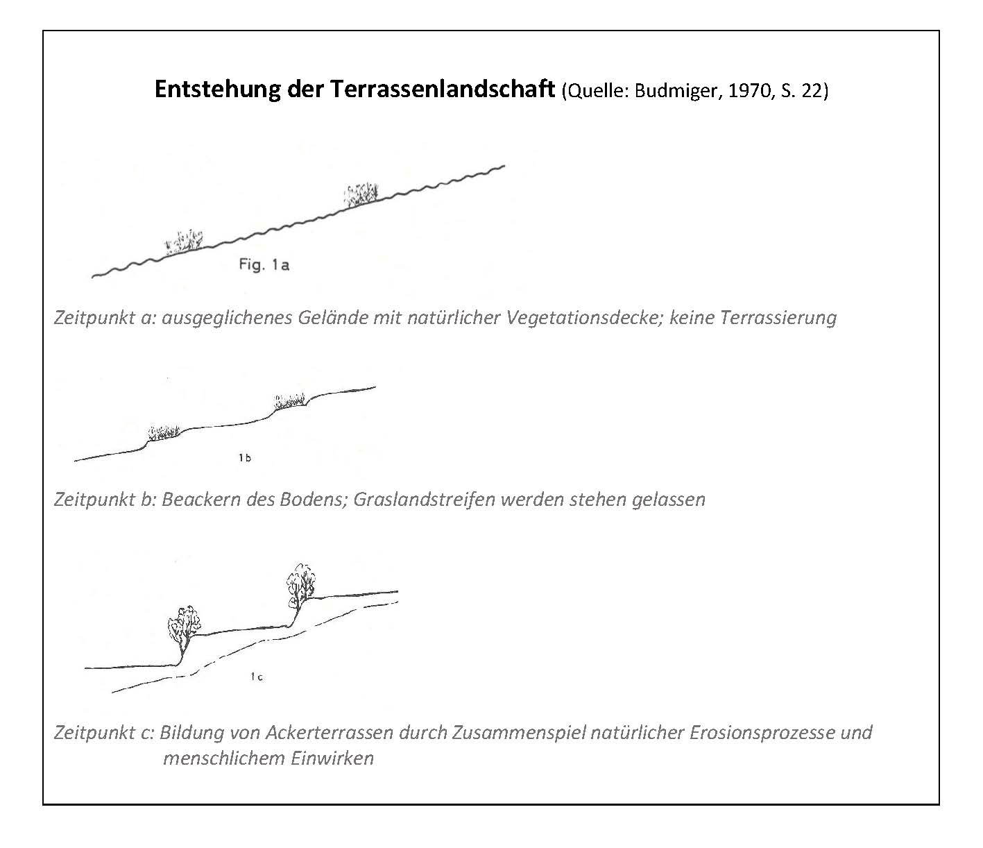 Das Gelände der Zälg von Erschmatt wies ursprünglich ein ausgeglichenes Gefälle ohne Terrassierung aus. Die treppenartig aufsteigenden Ackerterrassen entstanden durch das Zusammenspiel von natürlichen Kräften und menschlichem Einwirken über mehrere Generationen, wobei der Mensch der Auslöser dieses Erosionsprozesses war. Um Ackerfläche zu gewinnen, entfernten die Menschen die natürliche Vegetationsdecke, liessen aber parallel zum Hang absichtlich Graslandstreifen stehen. Durch das Hacken und Pflügen verschob sich die Erde talwärts. So entstanden nach und nach Terrassen aus bewachsenen Böschungen und Trockensteinmauern, die die Landschaft prägen. Die Steine, die beim Hacken und Pflügen zum Vorschein kamen, schichtete man platzsparend zu Lesesteinhaufen oder -mauern.