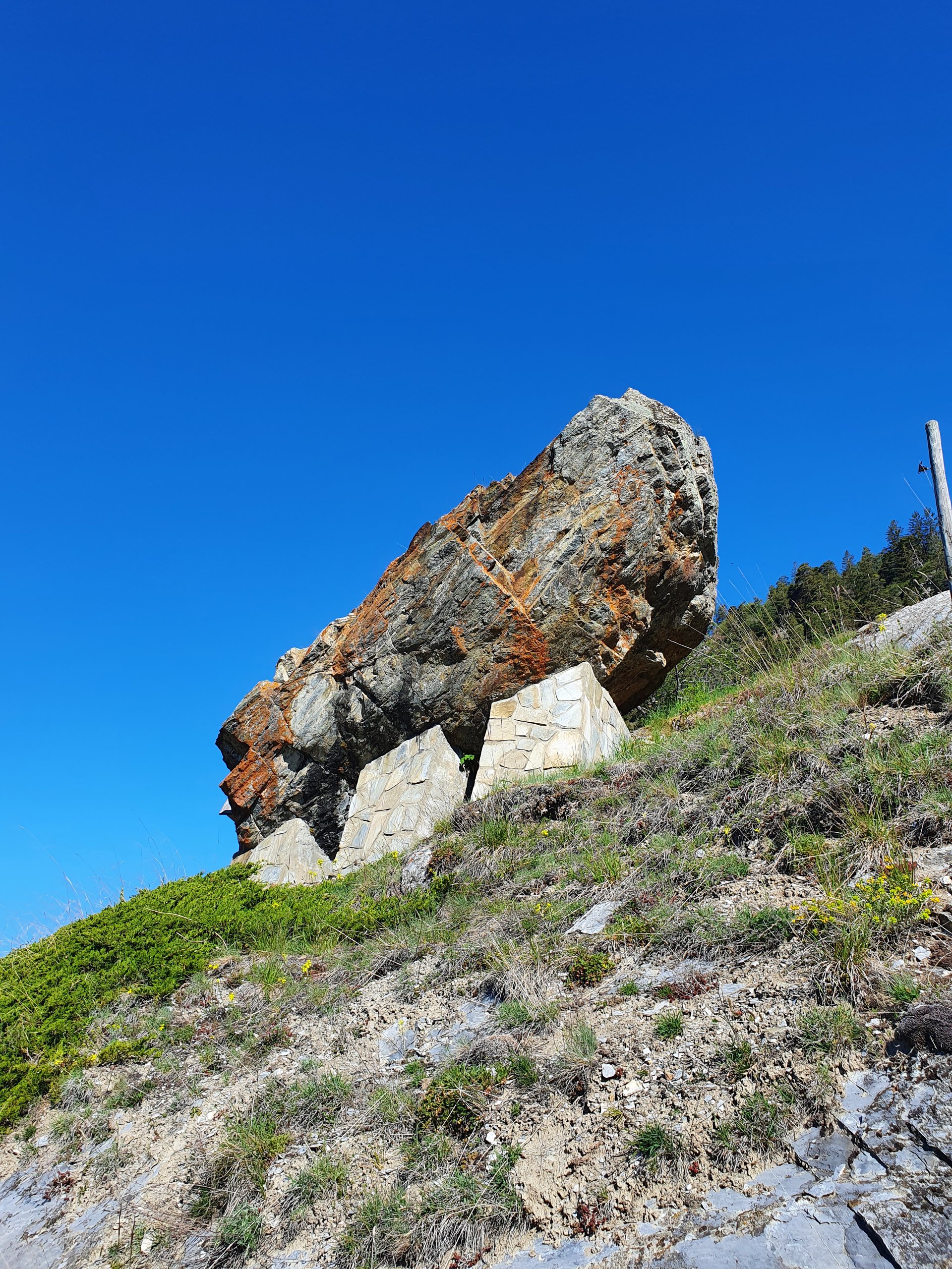 Der Hugostein liegt am Wanderweg Erschmatt-Jeizinen. Ein Zwischenhalt dort lohnt sich. Auf der Sitzbank geniesst man einen Rundblick auf das Dorf, das Weisshorn und das Rhonetal.