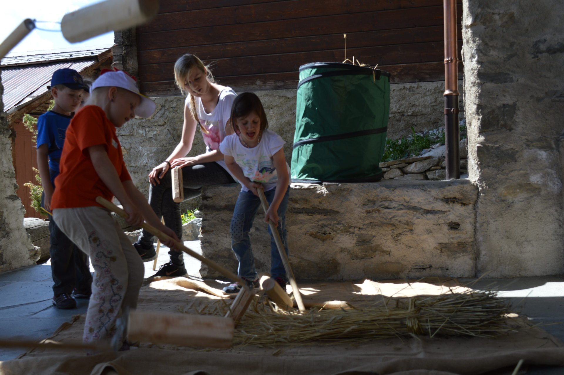 Dans l'atelier "Battage et vannage" situé dans la grange vieille de 400 ans, les élèves séparent les grains de seigle de la balle à l'aide d'un fléau et d'un van. Lors de l'atelier de mouture dans le "Hoher Spycher" historique, ils découvrent quel système de mouture permet d'obtenir la meilleure farine. Ils pourront ensuite l'emporter chez eux.