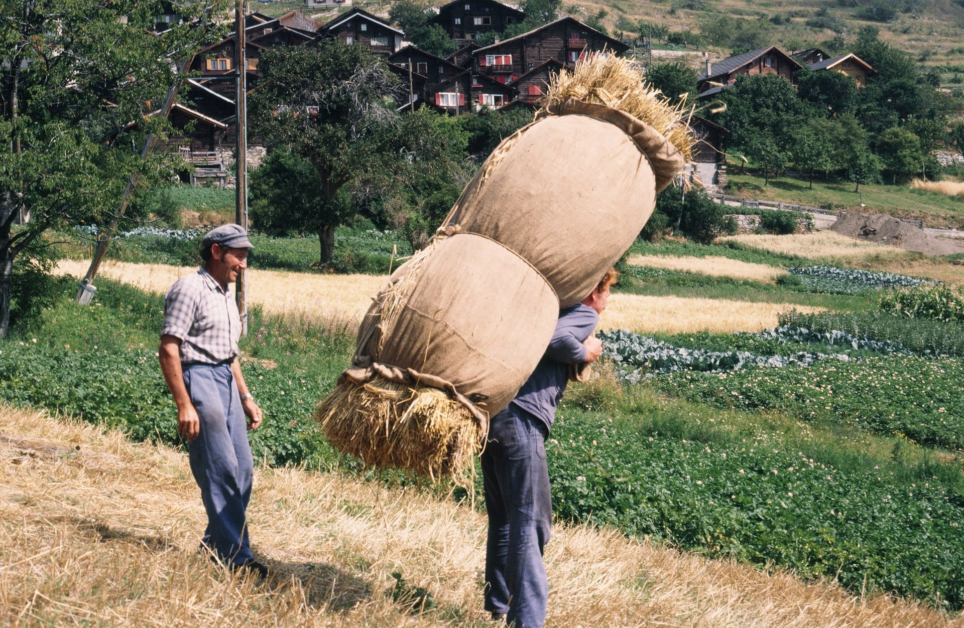 Das Dorf versorgte sich immer selbst mit Roggen. Um 1850 war die Roggenfläche am grössten. Ab dann kamen einerseits die Kartoffeln dazu, andererseits wandte man sich vermehrt der Viehwirtschaft zu. Später dann konnten die Leute Mehl und Brote im Tal kaufen. Bis zum Bau der Strasse (1956) wurden die Waren mit Rückenkörben oder Maultieren ins Dorf transportiert (siehe Foto mit Steiner Gustav). Seit Beginn der Industrialisierung (Lonza und Alusuisse) brauchten diese Betriebe zahlreiche Arbeitskräfte, um den Schichtbetrieb aufrechtzuerhalten. Das war eine Verdienstquelle und die Familien konnten so Lebensmittel auch kaufen und mussten nicht alles selber herstellen. Trotzdem war der Ackerbau immer ein wichtiges Element, nicht nur im Jahreslauf, sondern auch im Selbstverständnis der Bevölkerung.